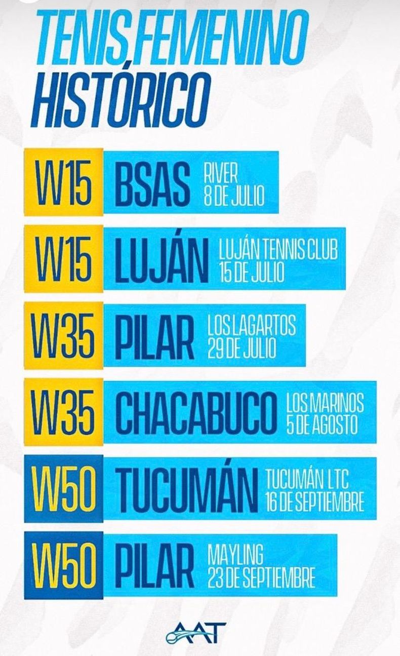 El circuito comenzará a disputarse el 8 de julio en River con un W15, luego el 15 de julio se jugará el segundo de esta categoría en Lujan. Más tarde se estará disputando el certamen W35. El primero en el Country Club Los Lagartos el 29 de julio y el segundo en Chacabuco el 5 de agosto. Finalmente, se encuentran los últimos dos torneos W50, el primero de estos se estará realizando en Tucumán el 16 de septiembre y el 23 de ese mismo mes en el Country Club Mayling.